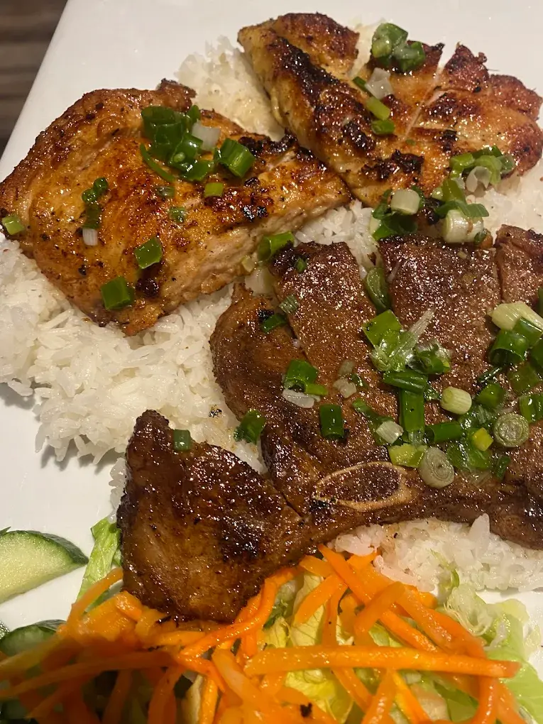 Tender grilled shrimp, lemongrass-marinated satay beef, and char-grilled chicken served over rice vermicelli noodles, accompanied by crispy spring rolls, fresh lettuce, cucumber, pickled carrots, and aromatic Vietnamese herbs. Finished with crushed peanuts and our house-made fish sauce vinaigrette.